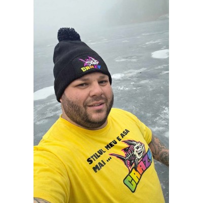 Pe față, tricoul este decorat cu un imprimeu logo CRAZY cu un mesaj specific, ideal pentru pasionații de pescuit și susținătorii brandului.